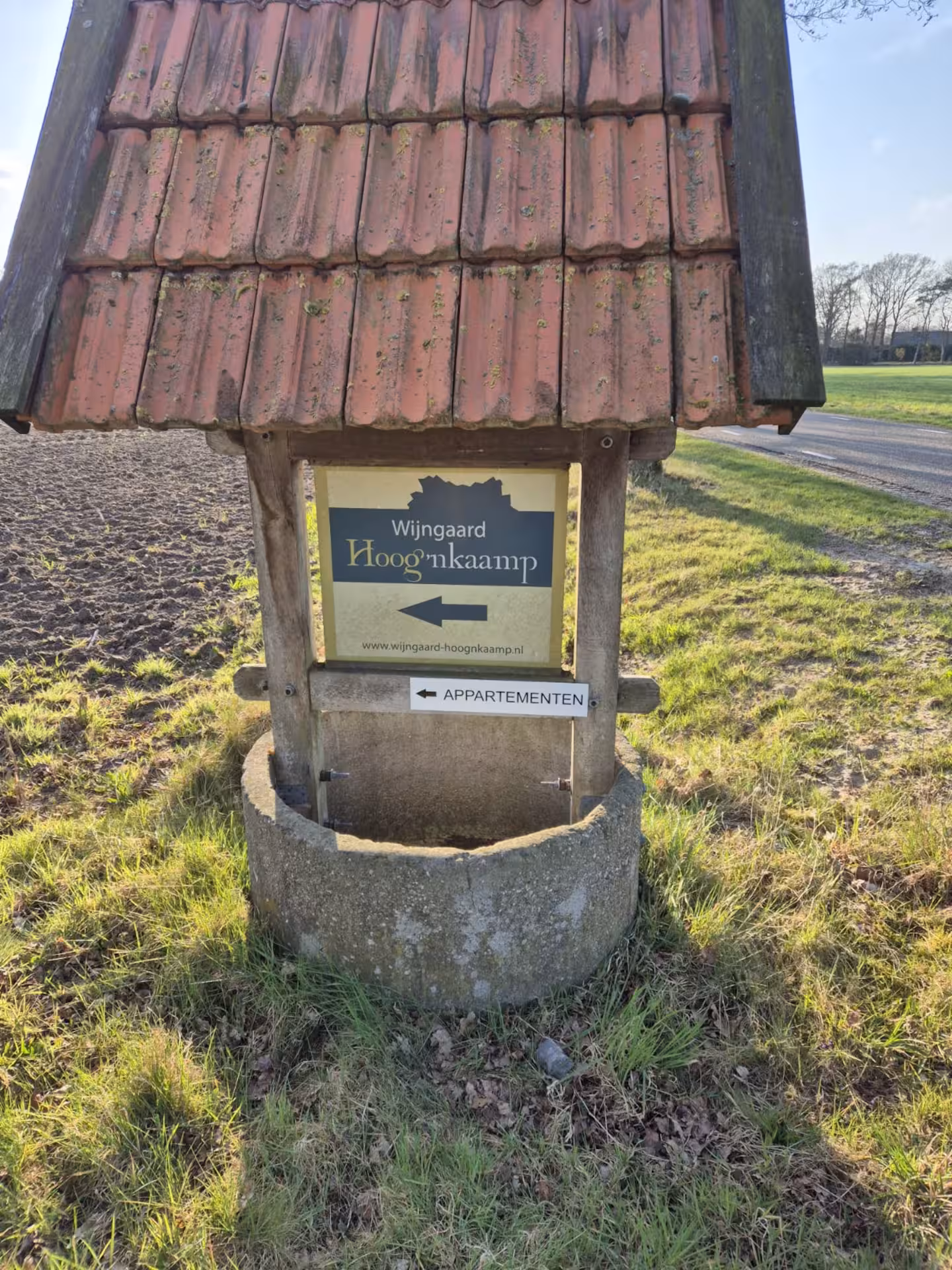 Hoog’nkaamp. Door de boeren werd vroeger hun beste, veelal hoger gelegen, landbouwgrond, “kaamp” of “es” genoemd. Op deze hooggelegen “kaamp”, waar wijngaard Hoog’nkaamp naar is vernoemd, worden de druiven voor onze kwaliteitswijn verbouwd. Tevens werd vroeger de boerderij, welke naast deze landbouwgrond lag, boerderij Hoog’nkaamp genoemd.